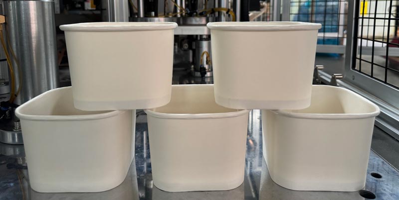 Flat paper blanks (190–320 GSM, single or double PE/PLA coated) are fed into the machine. Preheating softens the coating for better sealing.